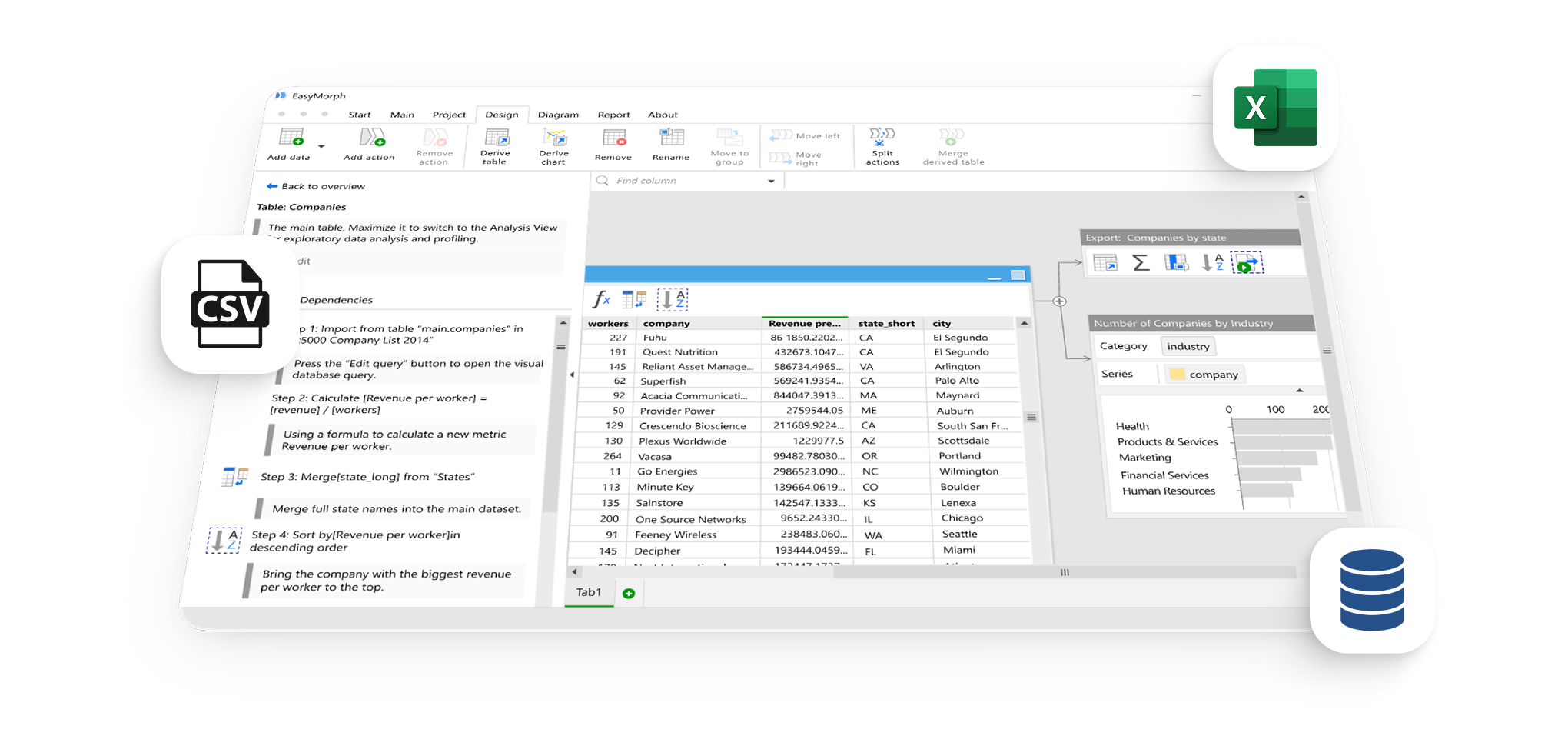 Download EasyMorph and you'll be able to merge hundreds of spreadsheets into one, clean dirty data, and generate reports — without writing a single line of code. In minutes, not days.